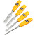 A popular set of four general purpose carpentry chisels manufactured from fine steel, each with bevelled edges, a contoured moulded handle and protective blade guard.