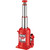 Professional quality bottle jack with a telescopic two stage hydraulic ram and screw extension provides a much greater maximum while maintaining a low minimum height level.